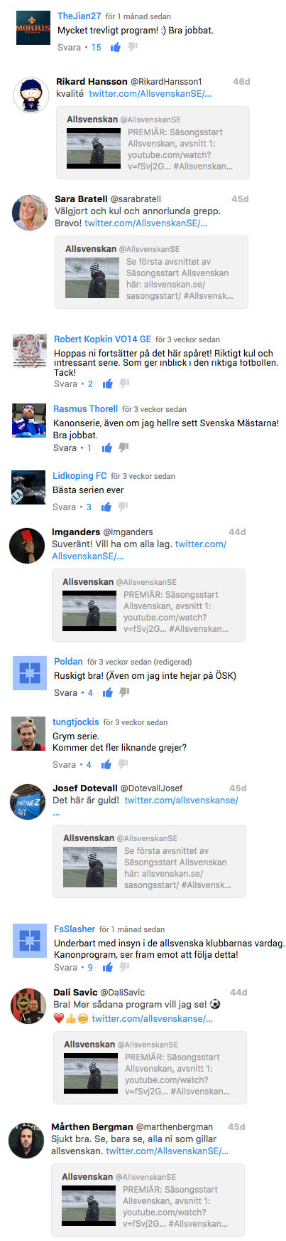 Det första avsnittet hade premiär i mitten av mars, och därefter följde ett nytt avsnitt i veckan fram till den allsvenska premiären. Mottagandet i media blev väldigt positivt, och mest glädjande av allt var all den positiva responsen vi fick från supportrar. Vi hade levererat någonting nytt som (oavsett lagtillhörighet) stärkte stoltheten för ligan och eldade på intresset inför premiäromgången.